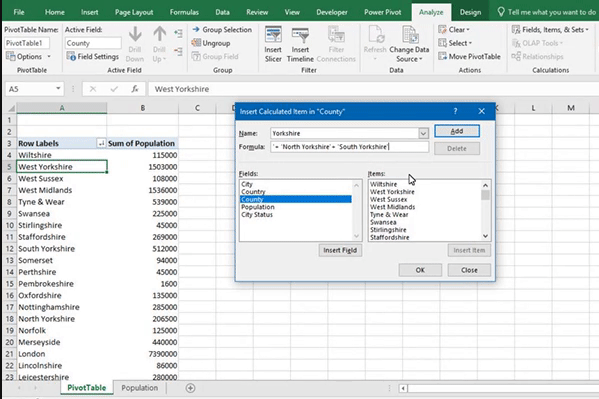 We can use Calculated Items to merge multiple row items in a PivotTable. For example, you would use Calculated Items if you had data for North, South, East and West Yorkshire and you wanted to merge the data into one Item called Yorkshire.