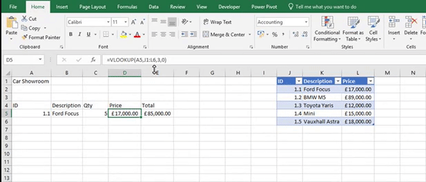 =VLOOKUP(A5,Cars,2,0)
